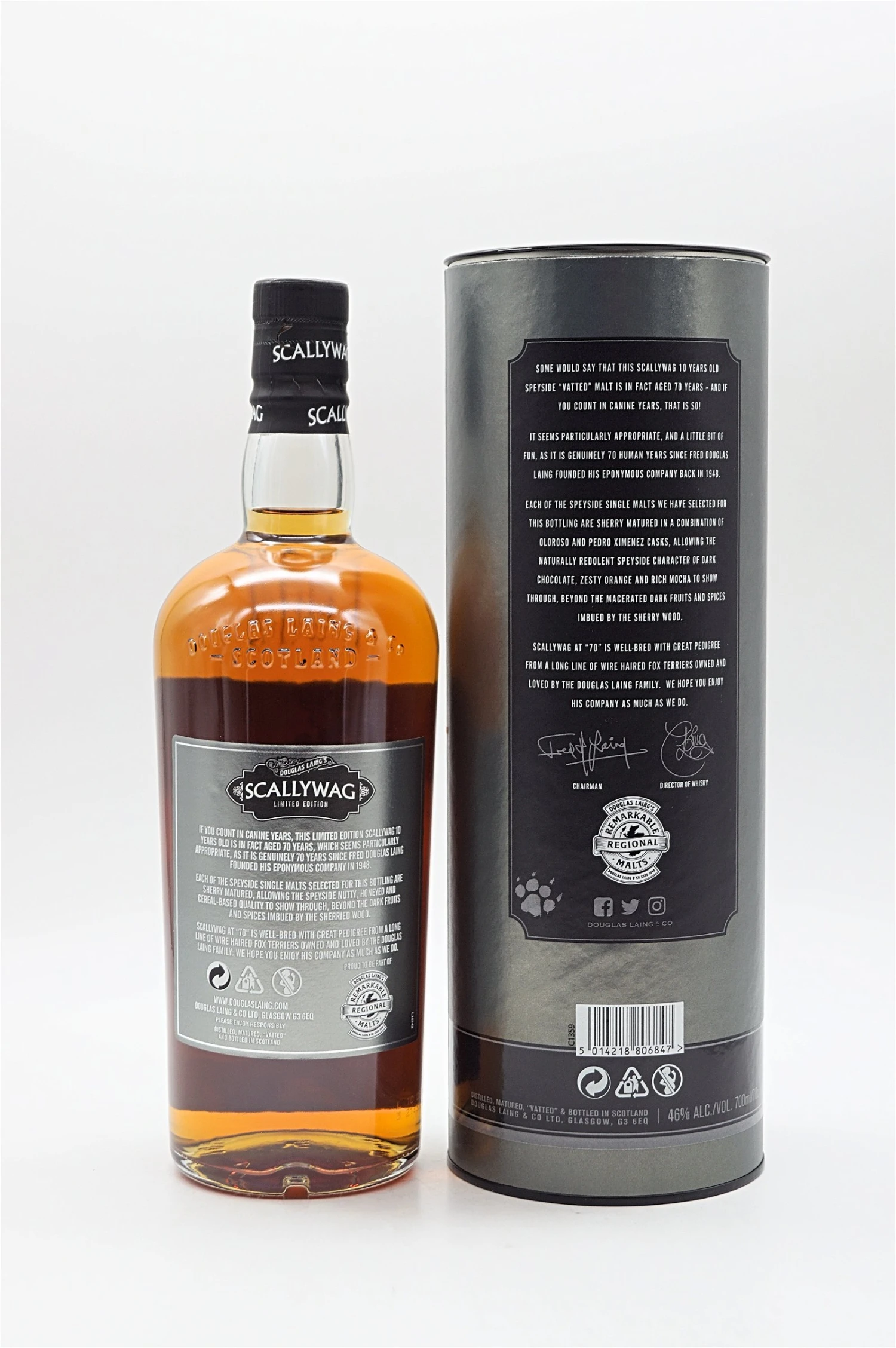 Scallywag 10 Years Old Small Batch Release ergänzt die klassische Core Edition als fortlaufendes Angebot. Diese Ausgabe wird ausschließlich in Pedro Ximenez- und Oloroso Sherry-Fässern gereift, um ein reichhaltiges, fruchtiges und dunkles Schokoladengeschmacksprofil zu erzielen.