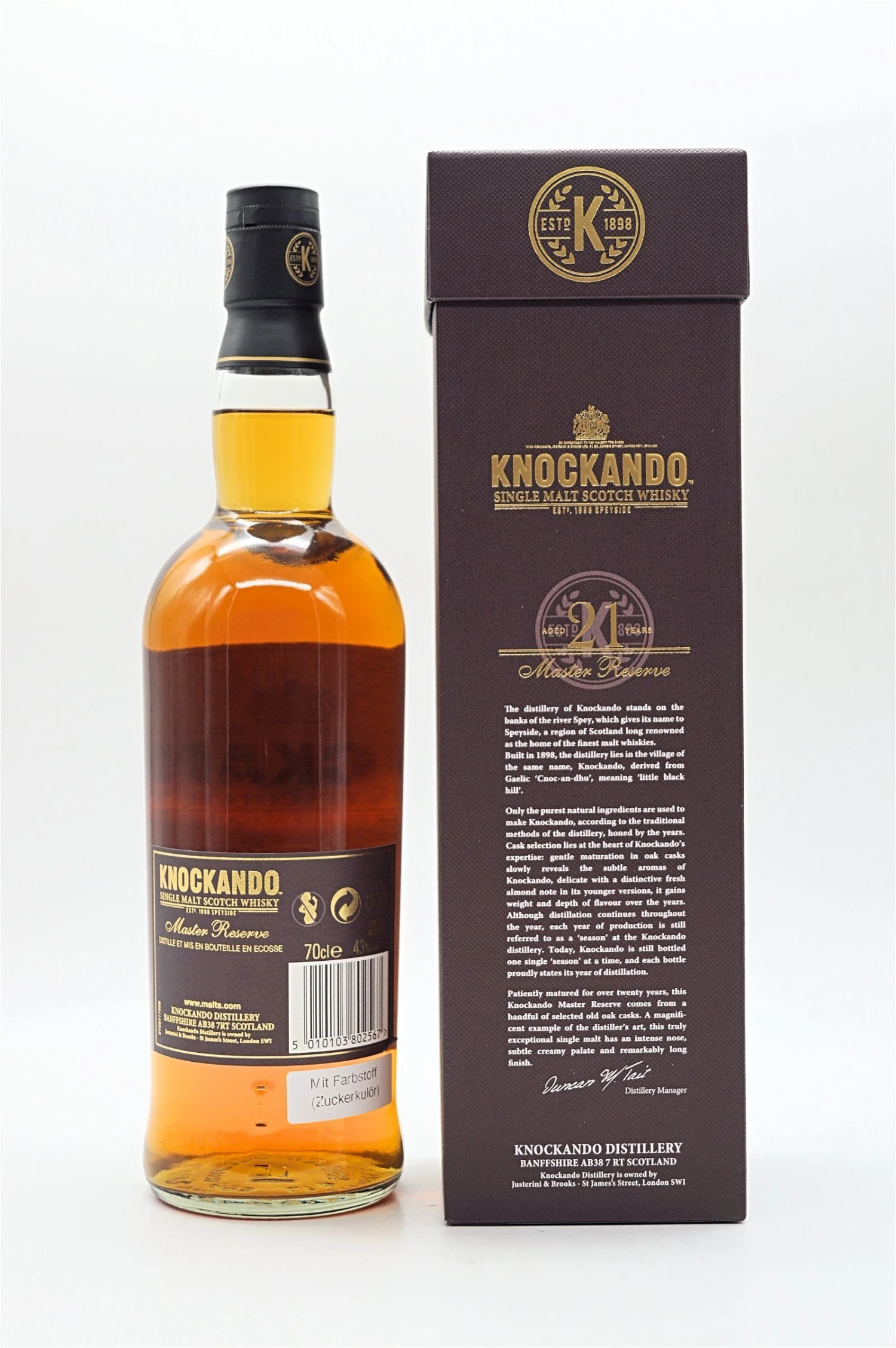 Knockando 21 Jahre Master Reserve hat intensive Frucht- und Vanillenoten, die sich auf Eis oder mit Wasser entfalten.