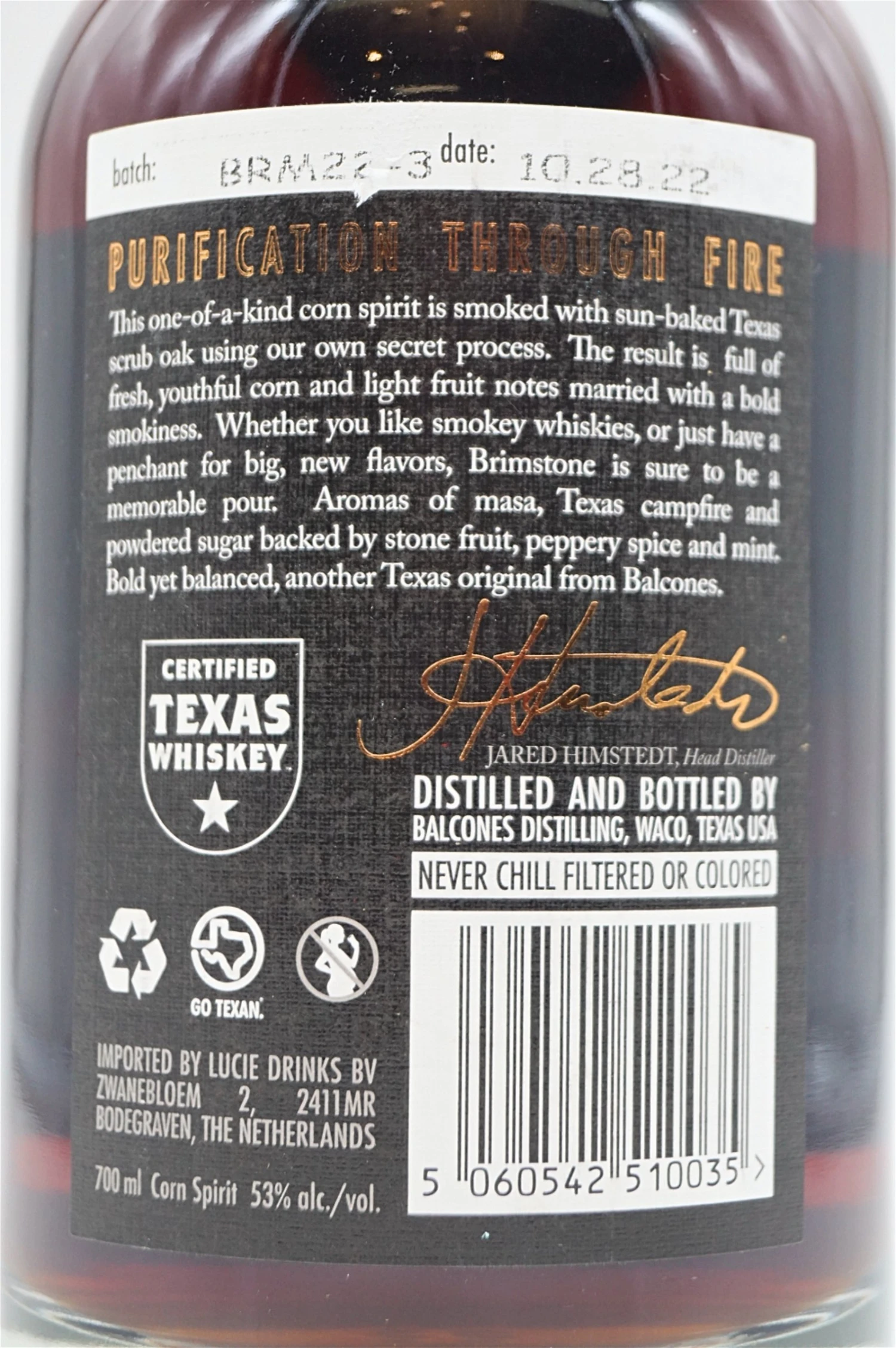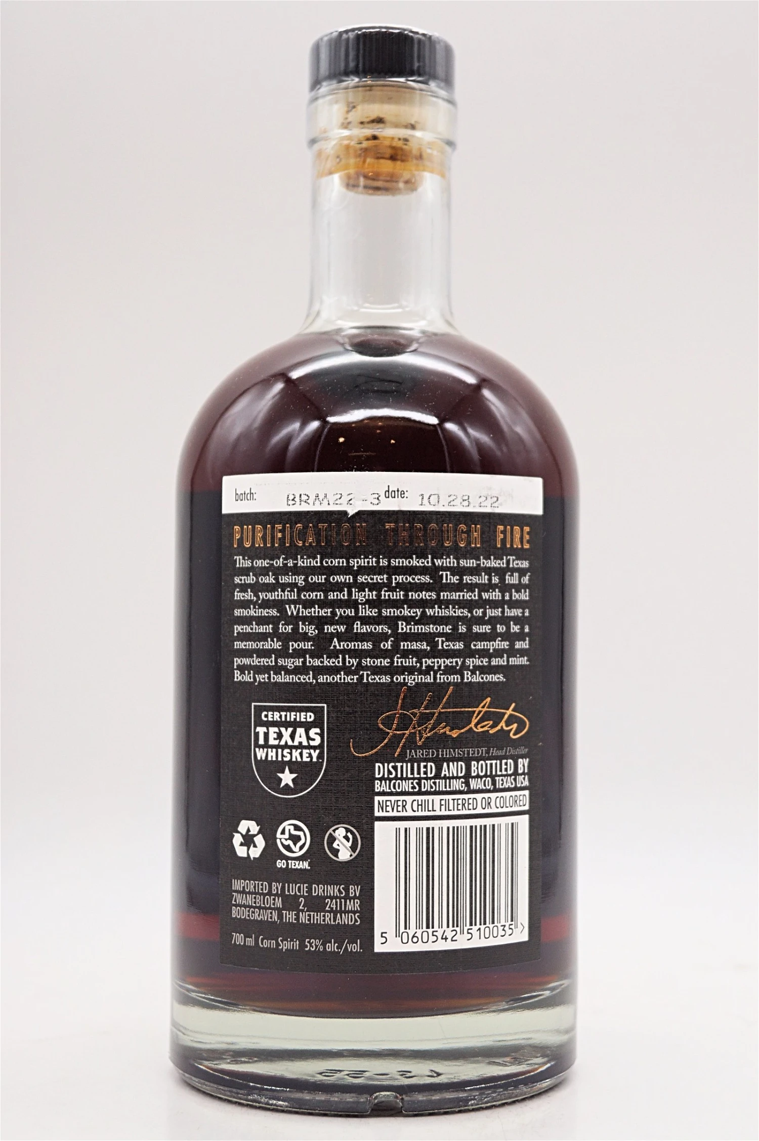 Der Balcones Brimstone ist ein wenig rauchiger Getreidebrand der von der texanischen Brennerei Balcones hergestellt wird. In einem geheimen Verfahren wird der Balcones Brimstone mit sonnengebranntem texanischem Buschwerk geräuchert. Dieses Verfahren verleiht dem Balcones Brimstone Geschmacksnuancen von Barbecue Soße, Kräutern und gerösteten Nüssen mit einem Hauch Rauch. Abgefüllt wird der Balcones Brimstone mit starken 53,0% vol.