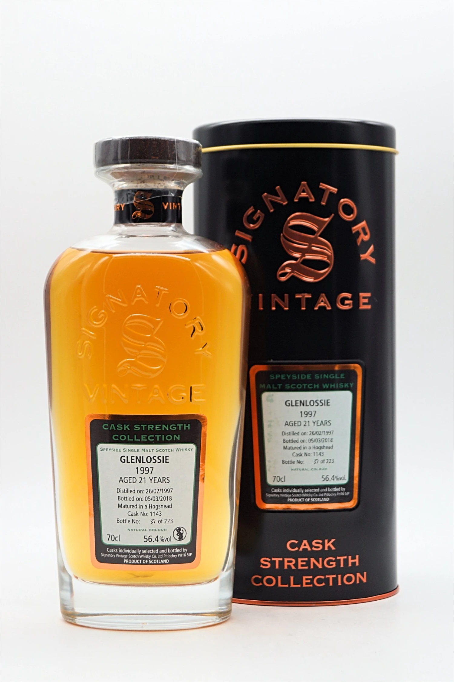 Dieser Glenlossie 21 Jahre alt 1997 Speyside Single Malt Scotch Whisky wurd in einem Single Cask Hogshead #1443 im März 2018 von Signatory Vintage für die Cask Strength Collection abgefüllt. Von dieser Ausgabe gibt es nur 223 nummerierte Flaschen.