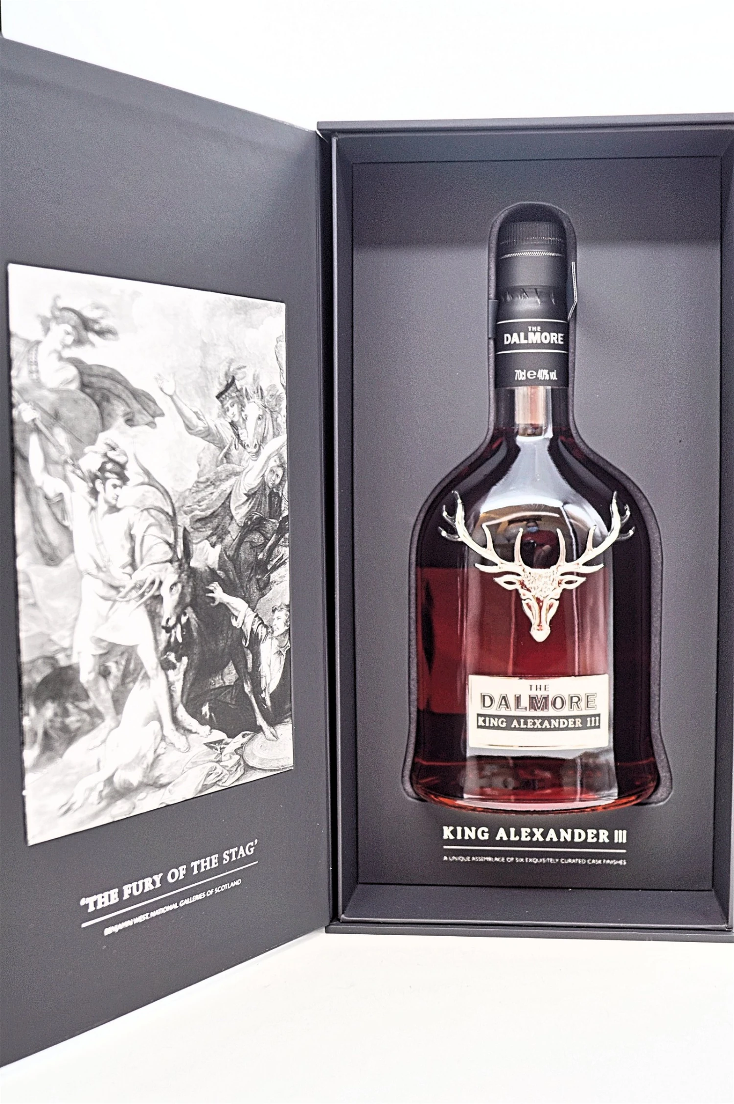 Der Dalmore King Alexander III ist ein ganz besonderer Single Highland Malt Whisky aus dem Hause Dalmore. Die Dalmore-Distillerie existiert seit 1839 und ist in den schottischen Highlands beheimatet. Die Brennerei war lange Zeit im Besitz der Mackenzies, dessen Oberhaupt im Jahre 1263 König Alexander den Dritten vor einem tödlichen Angriff eines Hirsches rettete. Seitdem tragen die Mackenzies den Hirschkopf auf ihrem Familienwappen, der bis heute auf jeder Dalmore-Flasche zu sehen ist.