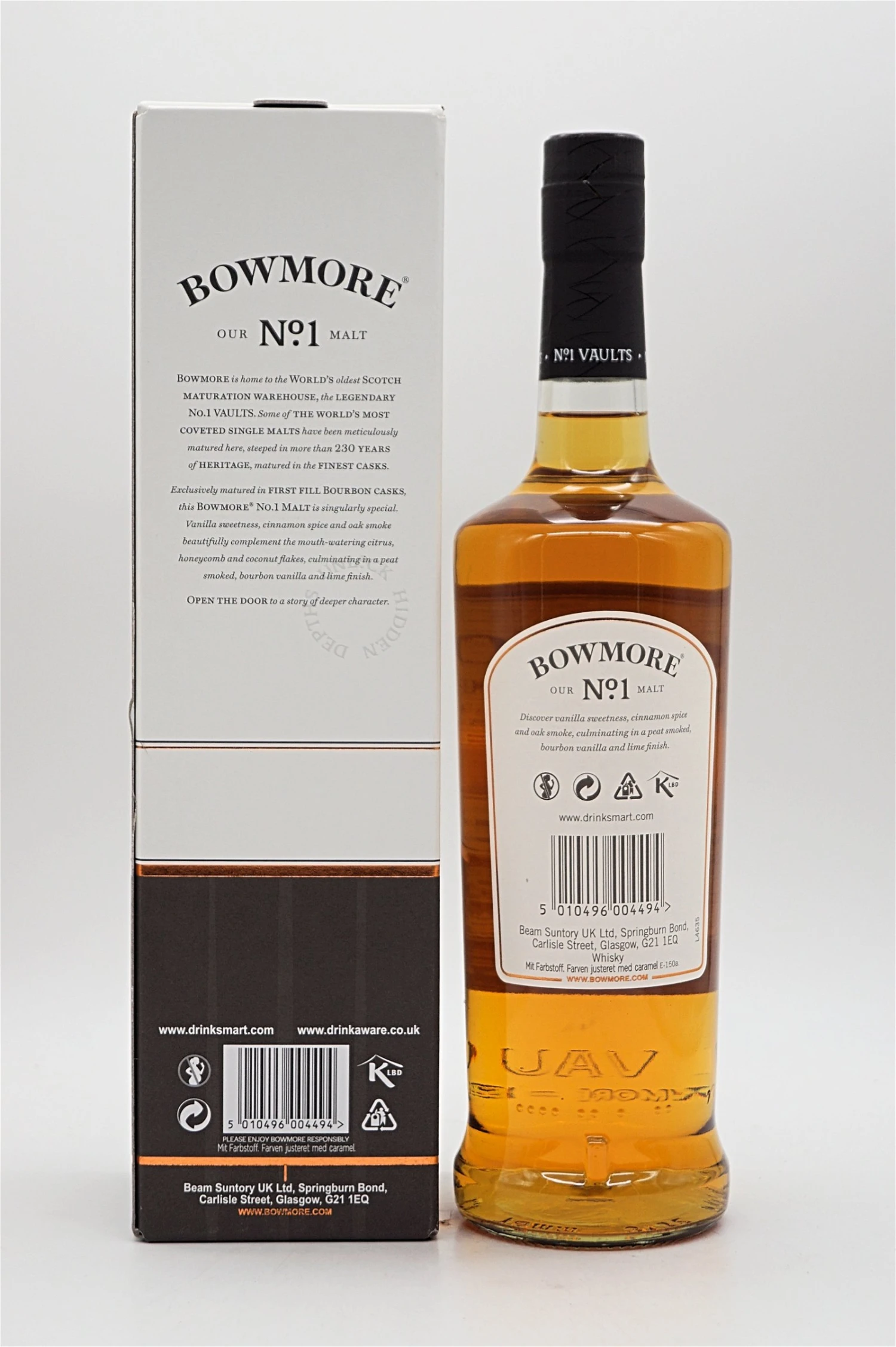 Gebrannt an einem Ort, der auf eine Tradition der Whisky-Reifung wie kein anderer zurückblickt, lädt der Bowmore No.1 Malt zum Studium eines ausgeprägten Charakters ein. Der ausschließlich in zum ersten Mal befüllten Bourbonfässern gereifte Bowmore No.1 Malt ist einzigartig anders. Die Süße von Vanille sowie Zimtwürze und Rauch von Eichenholz ergänzen stimmungsvoll die Nuancen von köstlicher Zitrusfrucht, Honigwabe und Kokosflocken und finden in den Geschmacksnoten Torfrauch, Bourbon-Vanille und Limone den krönenden Abgang.