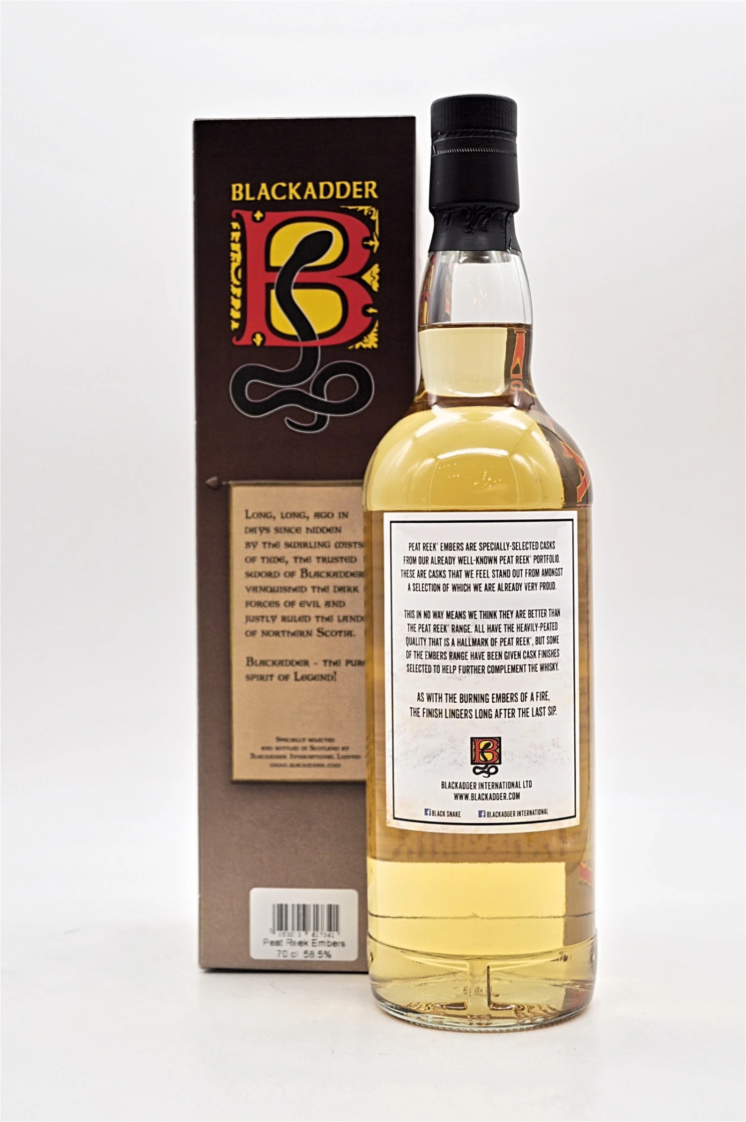 Immer wieder spannend zu verkosten sind die Malt Whiskies ohne Altersangabe und genauer Bezeichnung / Nennung der Destillerie. Der Peat Reek Ember Blackadder Raw Cask ist hier keine Ausnahme, wohl aber die Qualität, die uns präsentiert wird. Peat Reek bedeutet in der freien Übersetzung soetwas wie „Rauchender (Reek) Torf (Peat) und das ist es auch, was der Genießer erhält. Eine Einzelfassabfüllung aus Islay in Faßstärke. Abgefüllt als Raw Cask, dies bedeutet, dass der Whisky so wie er im Fass reifen durfte, abgefüllt wurde und sich am Boden der Flasche Sedimente abgesetzt haben. Nicht kühlgefiltert! Ohne Farbstoff!