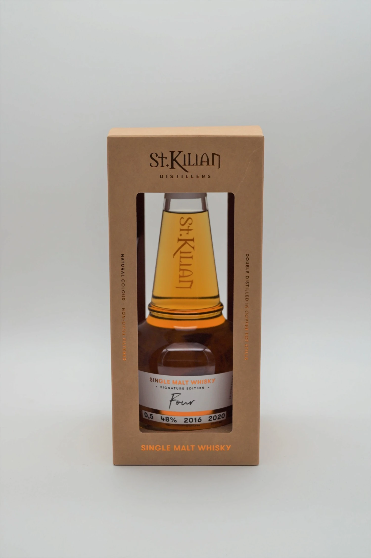 St. Kilian steht für Vielfalt: mehr als 170 unterschiedliche Fasstypen lagern derzeit in den Warehouses der Destillerie. Sie sind der Ausgangspunkt der Signature Edition – einer Reihe individueller Abfüllungen mit jeweils eigener Fass-Handschrift. Die aromatische Bandbreite von St. Kilian beweist nun der vierte Whisky – denn der „Four“ zieht alle Geschmacksregister: überraschend intensiv, würzig und rauchig.