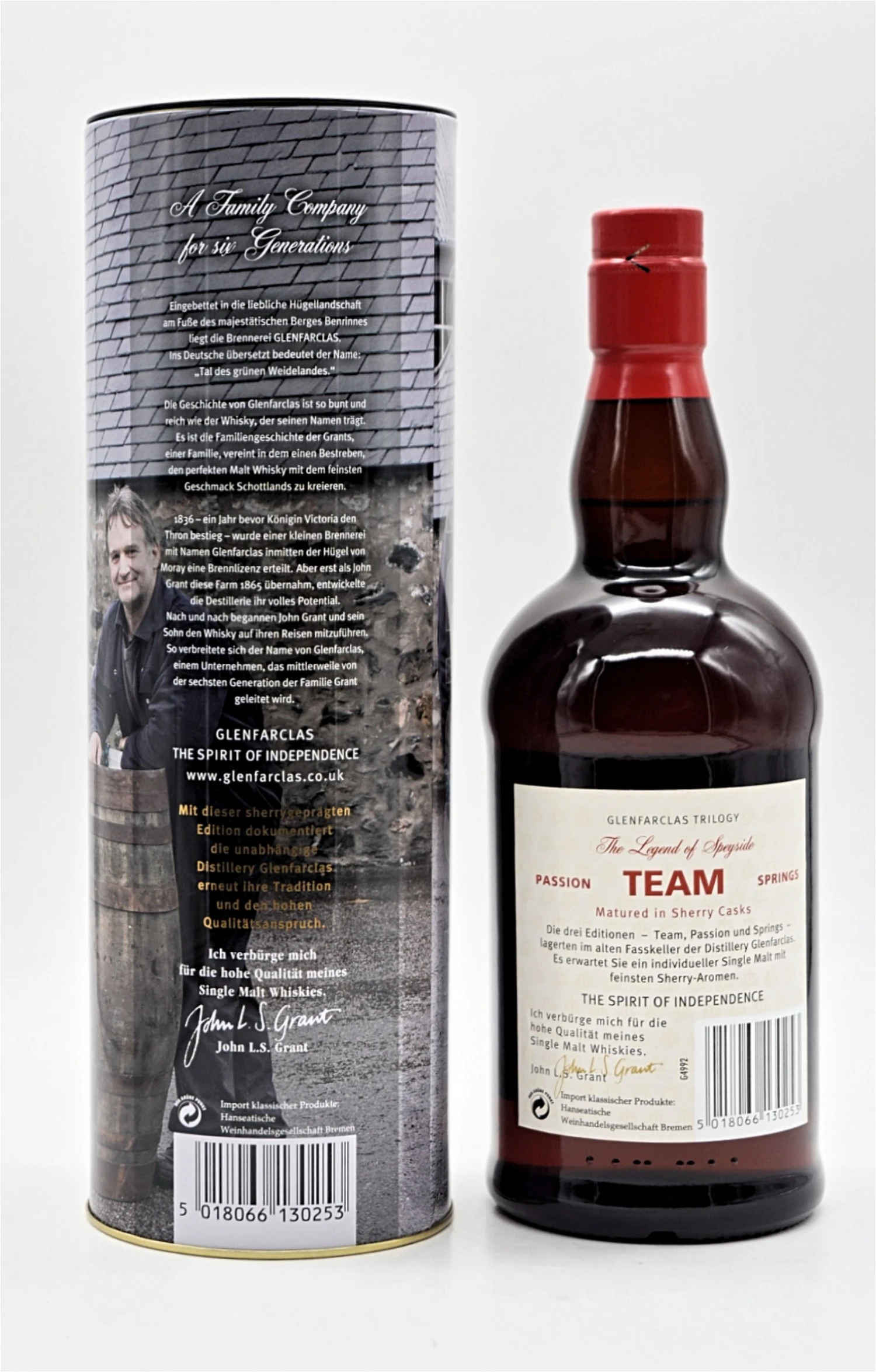 Die Multi-Vintage-Trilogy „The Legend of Speyside“ vereint mit PASSION, SPRINGS und TEAM Jahrhunderte alte Familientradition, absolute Reinheit der Natur und historischisches Handwerk der Glenfarclas Brennerei. Die Oloroso Fässer, die dieser Trilogie ihr besonderes Aroma verleihen, werden in der spanischen Küferei „Jose & Miguel Martin“ hergestellt. Bevor jedoch der Single Malt von Glenfarclas in diesen Fässern reifen darf, verbringen Sherrys ausgesuchter Bodegas eine Zeit in ihnen.
