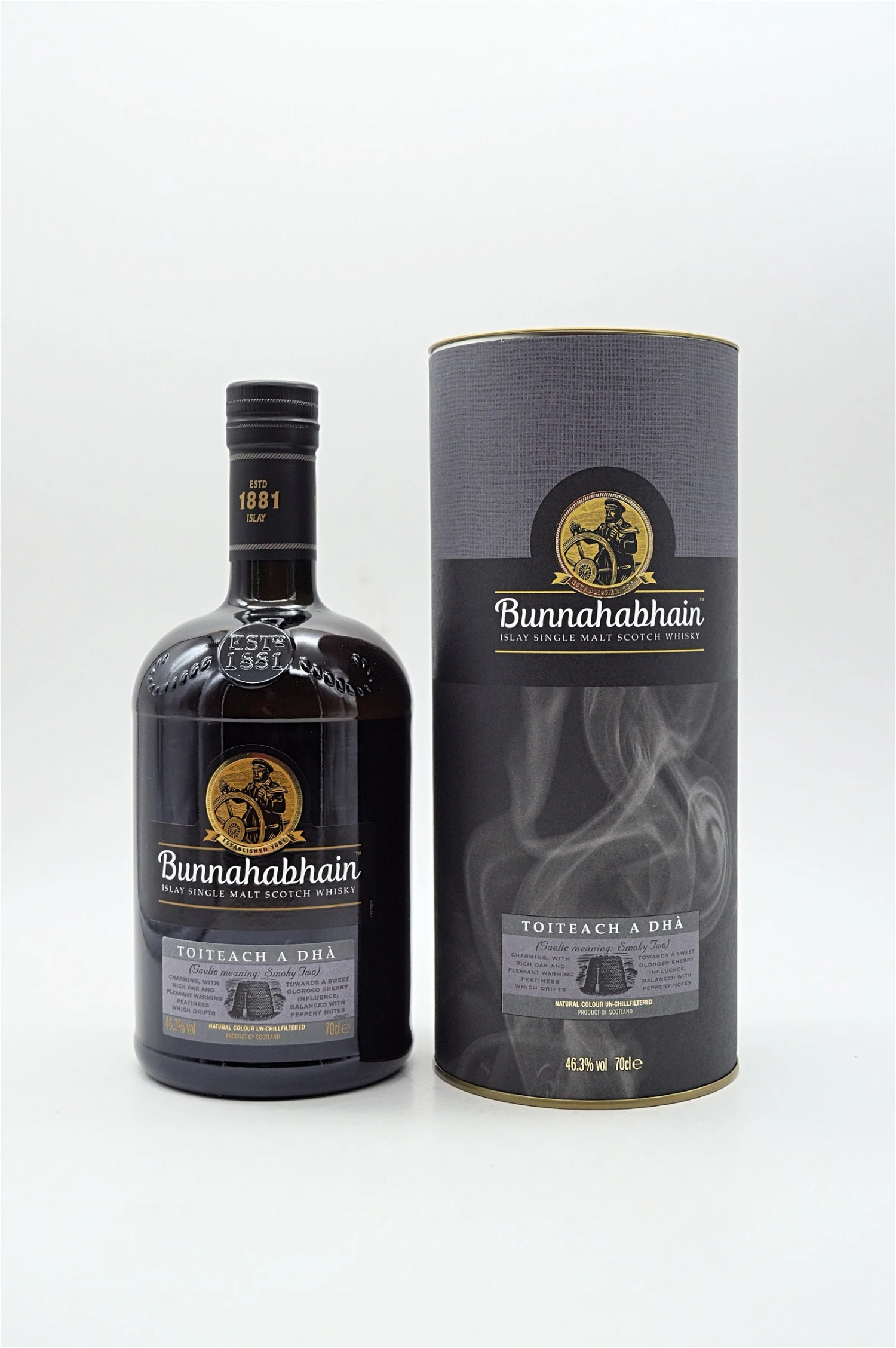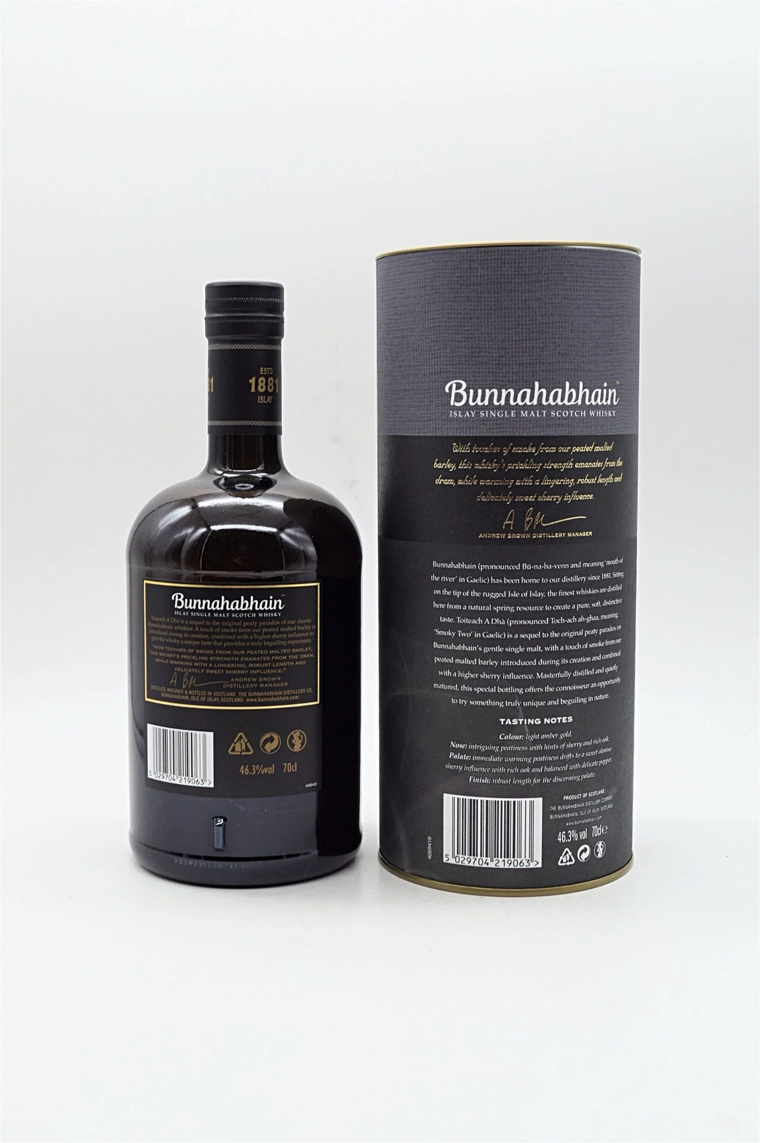 Toiteach A Dhà (ausgesprochen Toch-ach ah-ghaa) bedeutet auf schottisch-gälisch „Smoky Two“ und ist eine Fortsetzung des ursprünglichen Torfparadoxons auf Bunnahabhains sanftem Single Malt. Um diese Mòine-Variante zu kreieren, wählte der Senior Blender, Dr. Kirstie McCallum, eine Kombination aus ehemaligen Bourbon- und Sherry-Fässern aus, die dann in den Küstenlagern in der Bunnahabhain Bay vollständig gereift waren. Mit einem Hauch von Rauch aus dem getorften Gerstenmalz geht der Kribbeln dieses Whiskys vom Dram aus, während er sich mit einer anhaltenden, robusten Länge und einem zart süßen Sherry-Einfluss erwärmt.