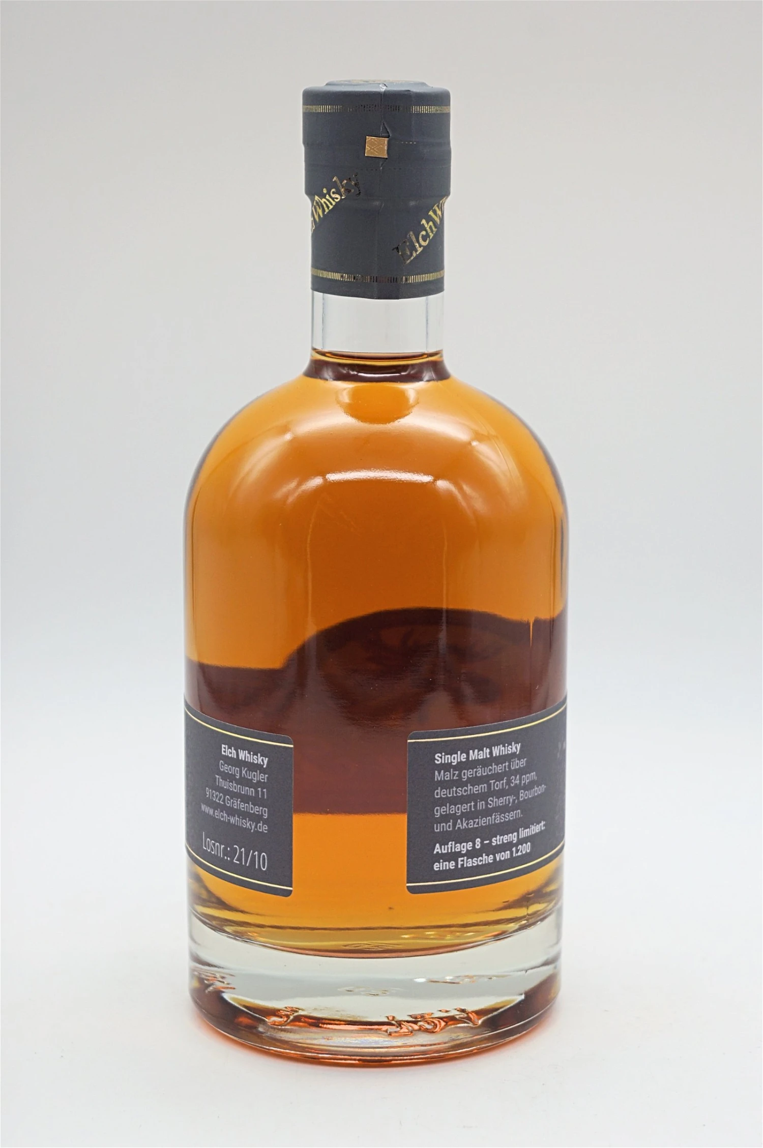 Erstmals wurde Malz mit deutschem Torf (ppm 32) geräuchert, um eine einzigartige Whisky-Spezialität zu erschaffen. In der Brennerei wird dieses Malz zu Würze verarbeitet, 7 Tage vergoren und anschließend in der Verschlussbrennerei schonend gebrannt. Das entstandene Destillat wird auf 50,2 % Alkohol verdünnt, in Bourbon-, Sherry– und Akazienfässer gefüllt und mindestens 3 Jahre gelagert.