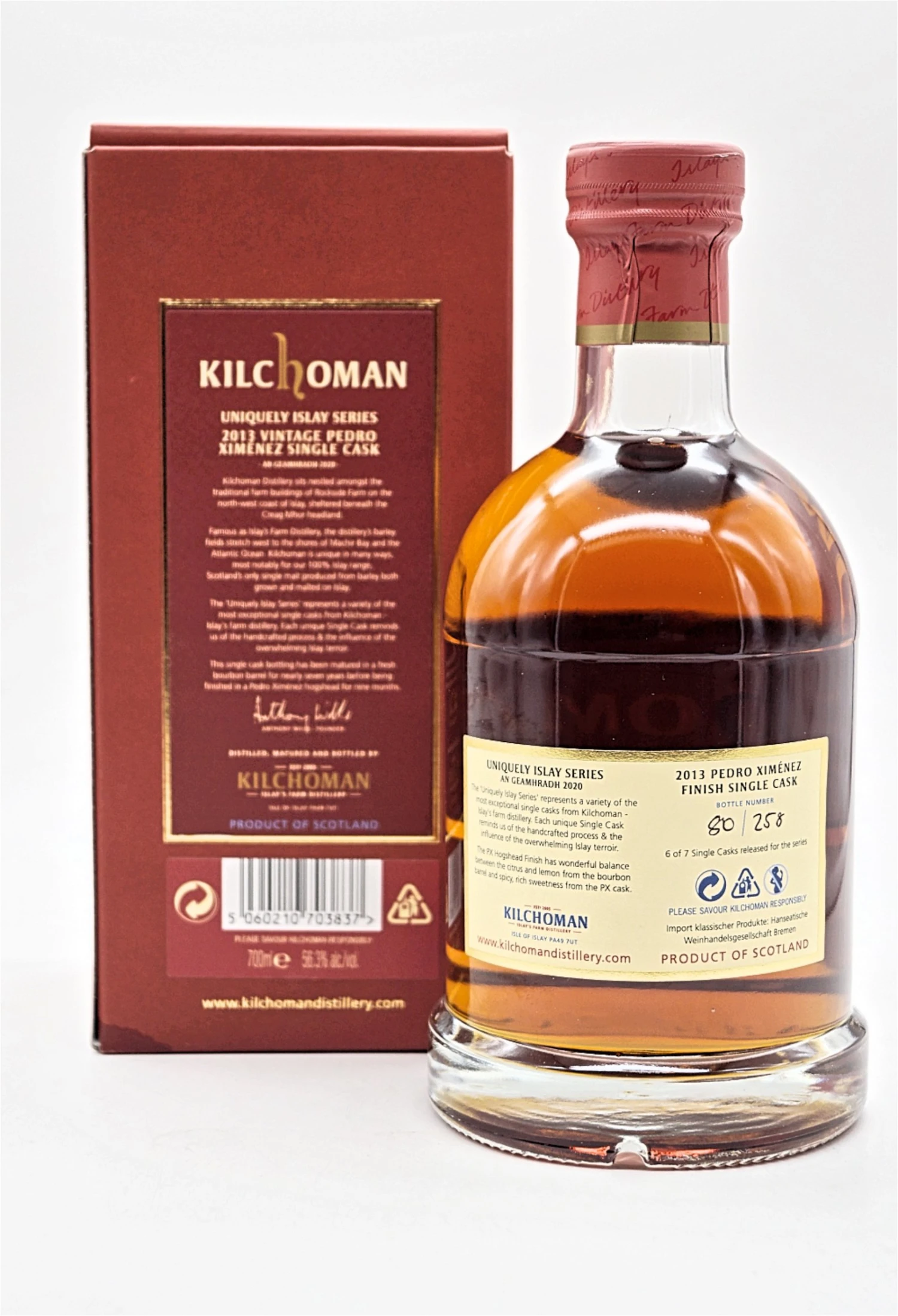 Diese spezielle Abfüllung mit dem Namen „An Geamhradh 2020“ reifte vom 04.04.2013 bis 05.11.2020, zuerst in einem einzigen Ex-Bourbon-Fass mit der Nummer 212/2013, bevor er in in einem Pedro-Ximenez-Hogshead gefinished wurde. Letztendlich wurden nur 258 Flaschen abgefüllt.