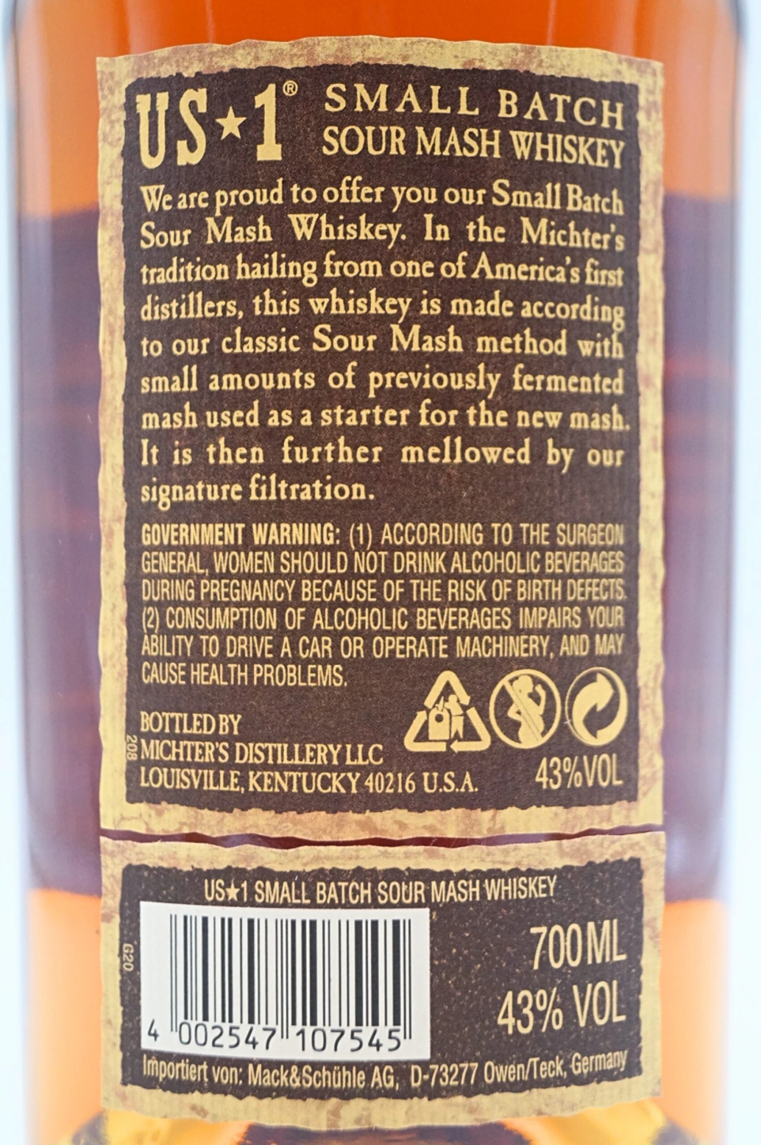 In den 1970er und 1980er Jahren war Michters Original Sour Mash Whisky das beliebteste Einzelprodukt der Brennerei. Während der Spitzname „Sour Mash“ aus dem gleichnamigen Whisky-Produktionsprozess stammt, bei dem ein zuvor fermentierter Brei als Starter für die zu fermentierende neue Maische verwendet wird, ähnlich wie bei der Herstellung von Sauerteigbrot, wurde Michters Original Sour Mash für seine Herstellung und den einzigartigen Geschmack ausgezeichnet. Aufgrund seiner einzigartigen Getreideauswahl kann es nicht als Roggen oder Bourbon eingestuft werden. Nachdem Michters Original Sour Mash Whisky 1989 vom Markt verschwunden war, kehrte er 2012 mit seiner Einführung in die US*1-Linie triumphierend zurück. Michters US*1 Sour Mash ist dem Profil und dem Gaumen seines Vorgängers treu geblieben und hat sich schnell zu einem Liebling der Whisky-Enthusiasten entwickelt.